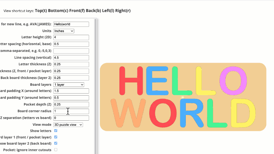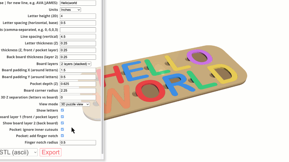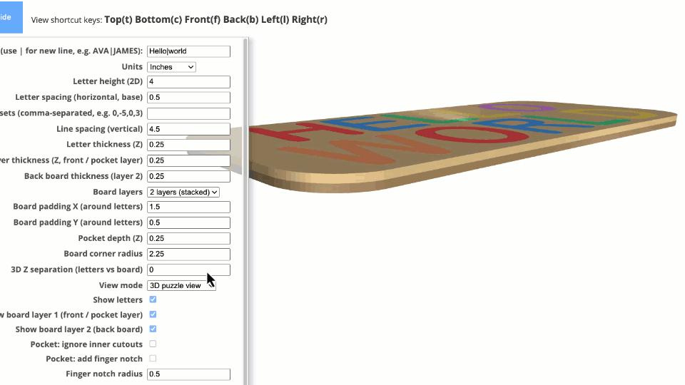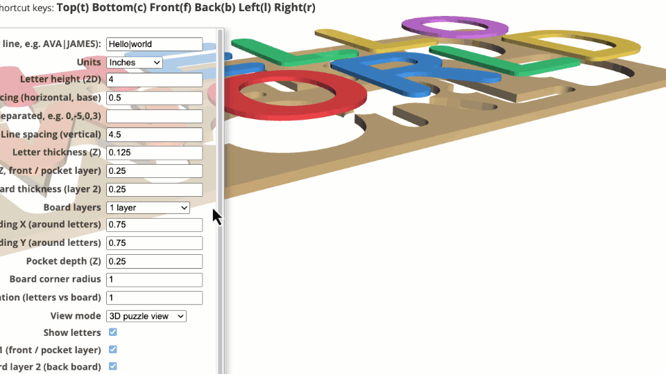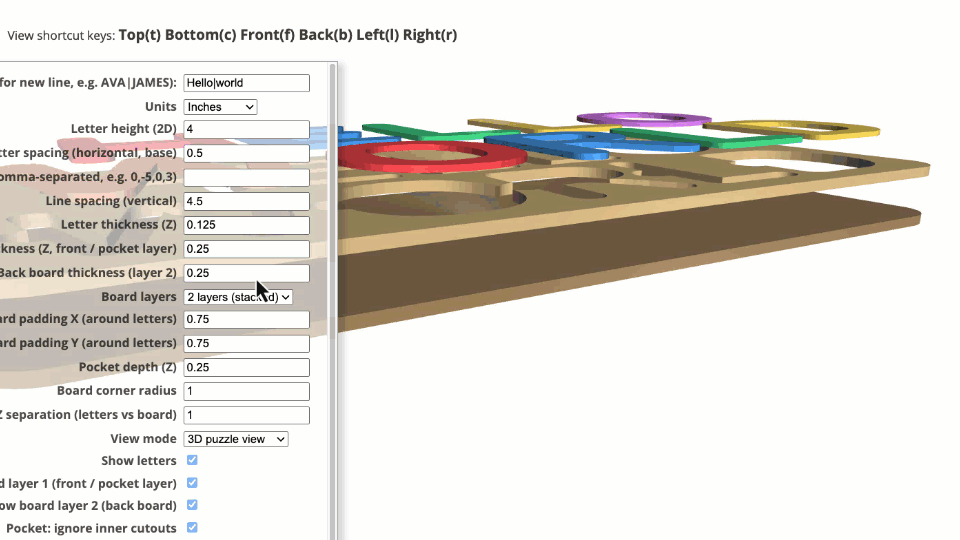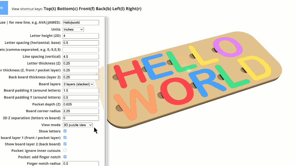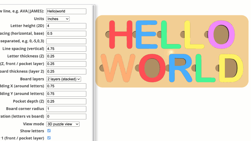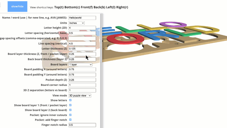 Name Puzzle Designer is an indirect 3D modeling tool tailored specifically for laser cutters, 3D printers, and CNC machines. Customization is facilitated through an intuitive menu with customizable parameters.