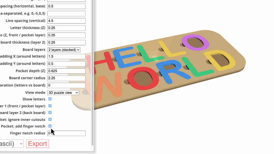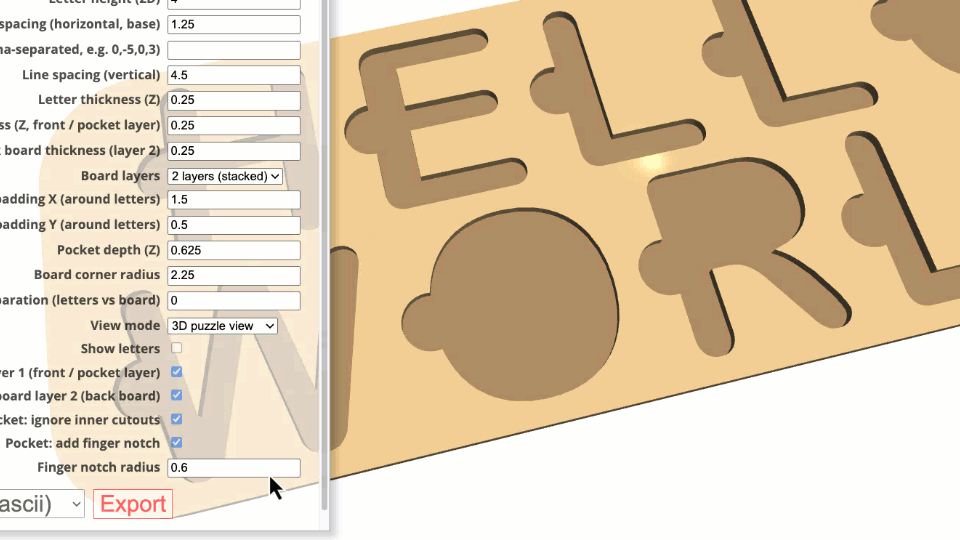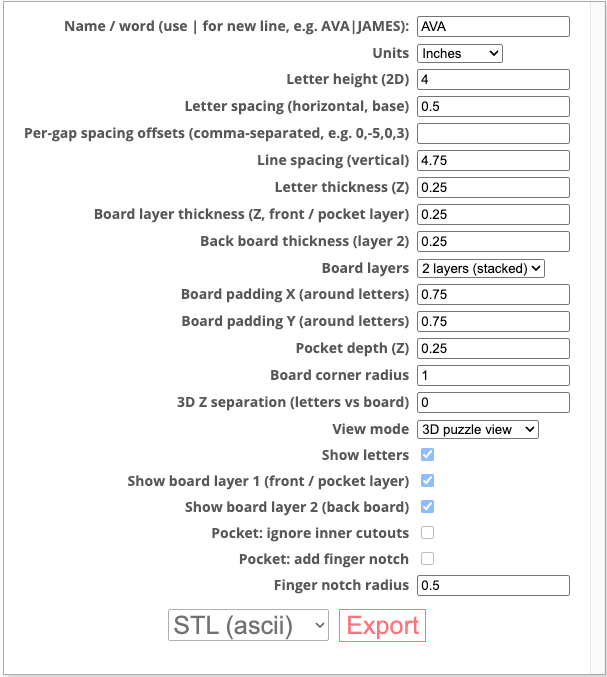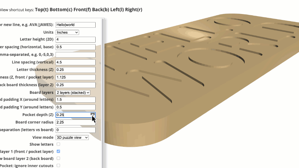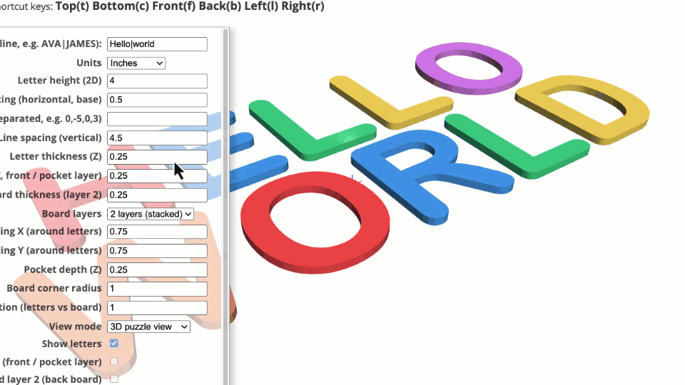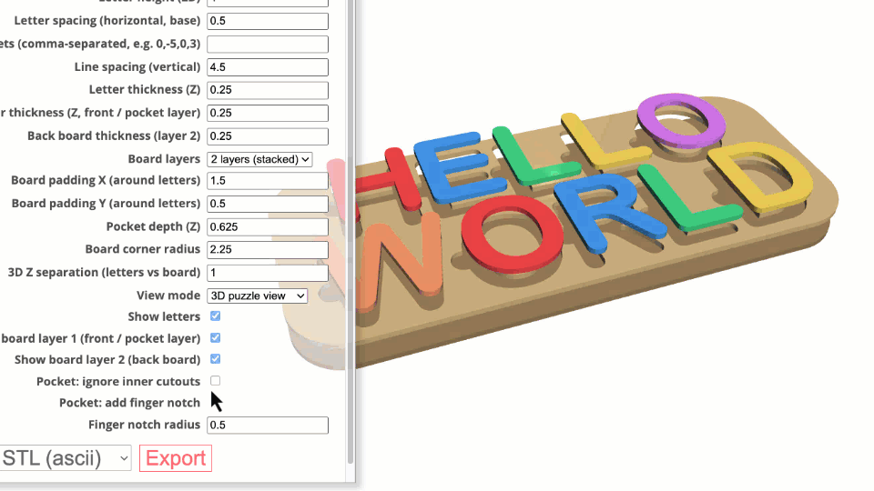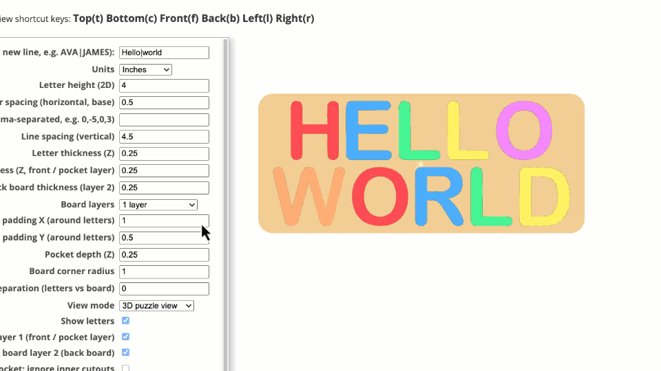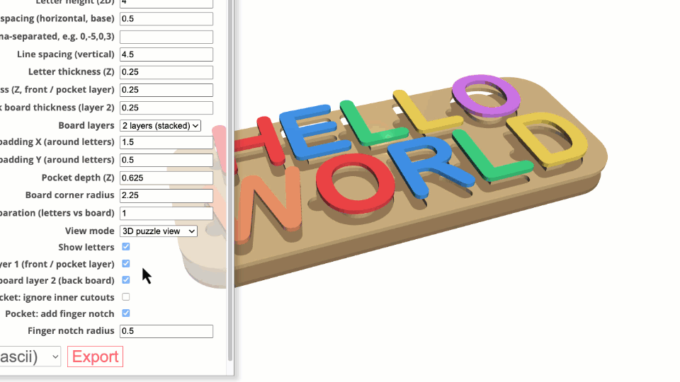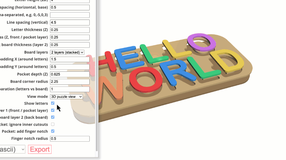 Name Puzzle Designer is an indirect 3D modeling tool tailored specifically for laser cutters, 3D printers, and CNC machines. Customization is facilitated through an intuitive menu with customizable parameters.