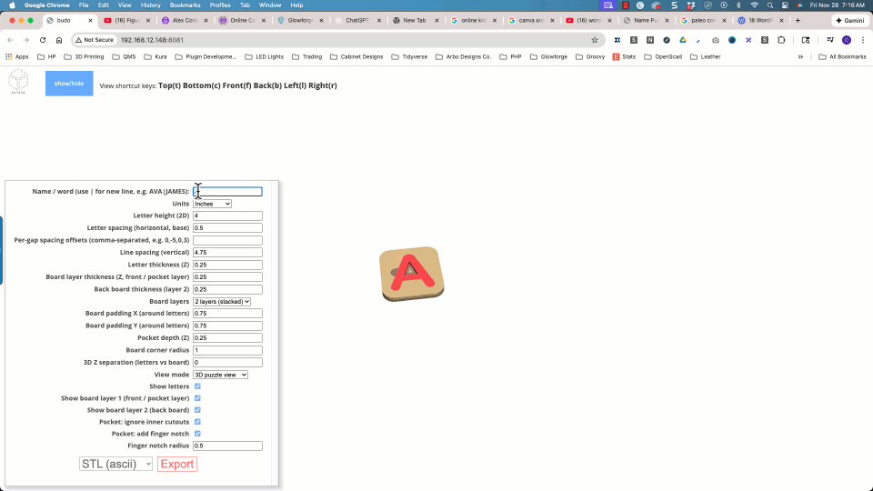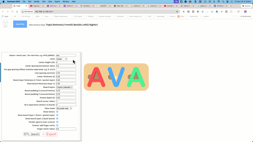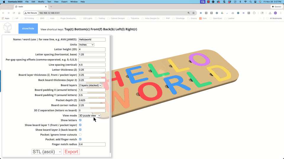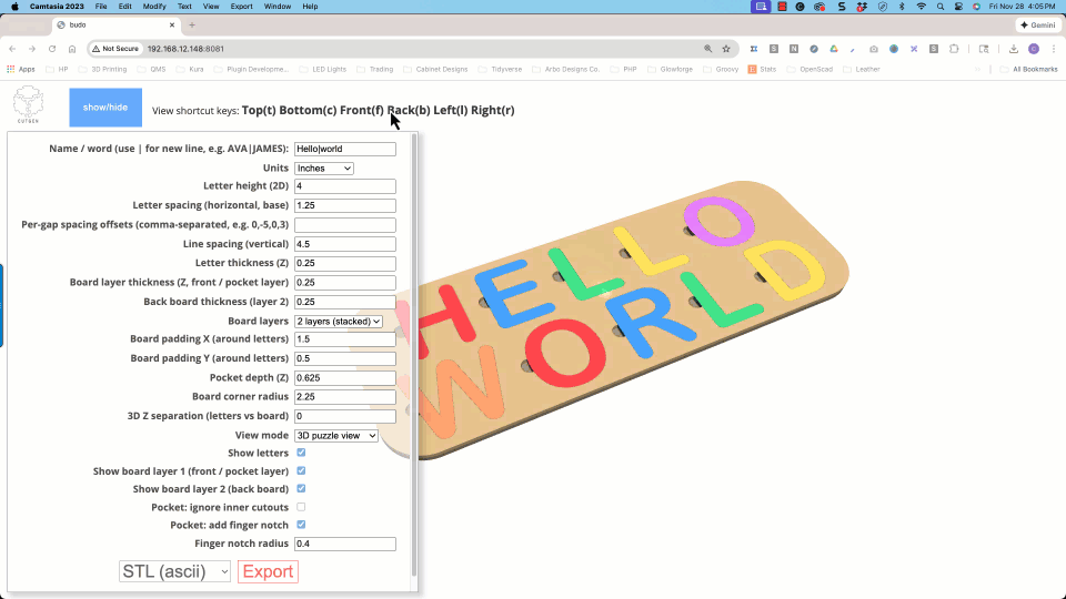 The Name Puzzle Designer script operates within the powerful JSCAD environment—an open-source project that enables parametric 3D modeling through code. Check it out here: JSCAD.