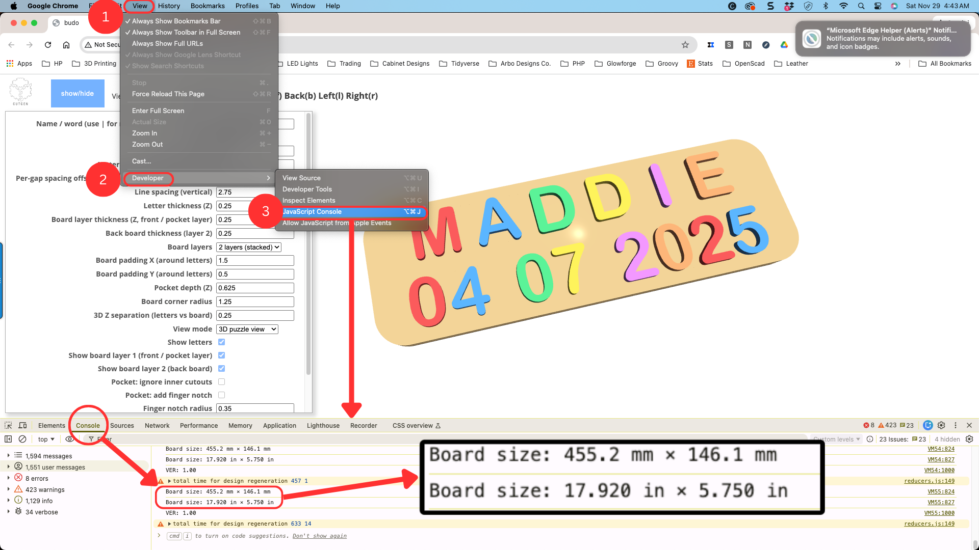 After setting your final custom parameters, you can find the final board dimensions printed in the web browser’s ‘console’ window. How to access the console window depends on the browser type.