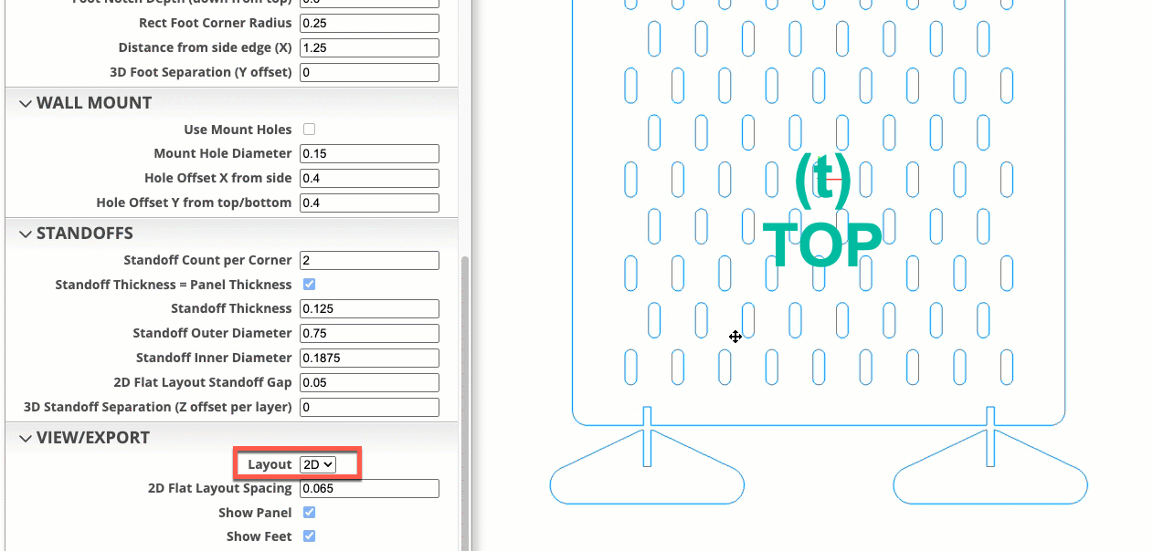 When switching from 3D to 2D flat layout view, press the ‘t’ keyboard key for a top down layout view, to better visualize what the 2D output SVG will look like.