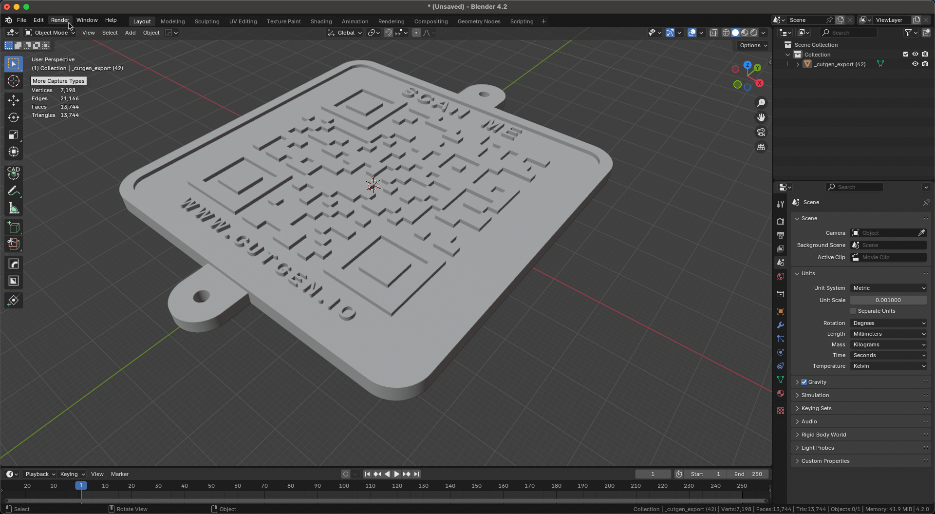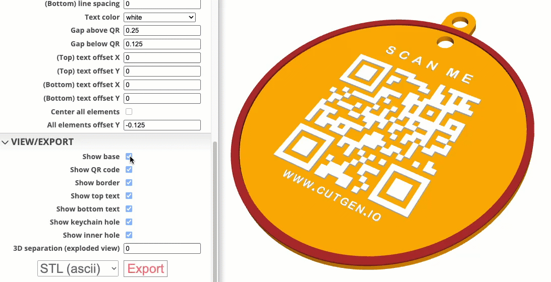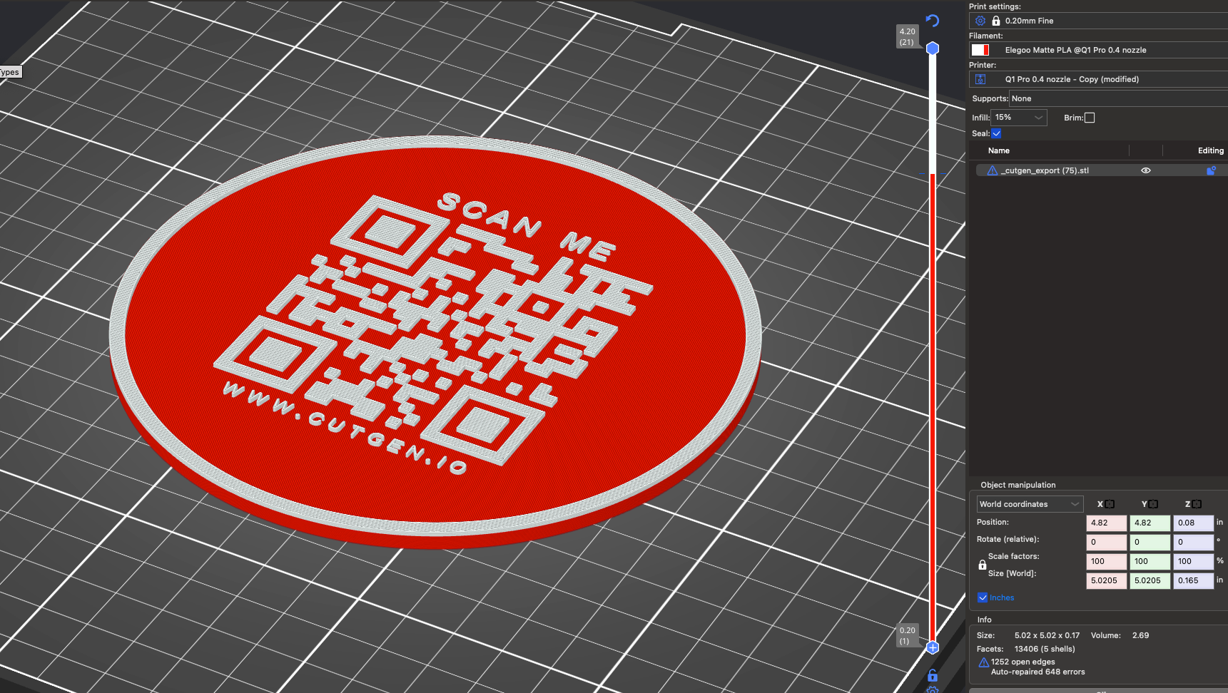 When importing the STL into your slicer, be aware that if you ‘split into parts’, the QR code will be broken into its smaller pieces which may be problematic or hard to manage. It’s best to keep as one grouped object.