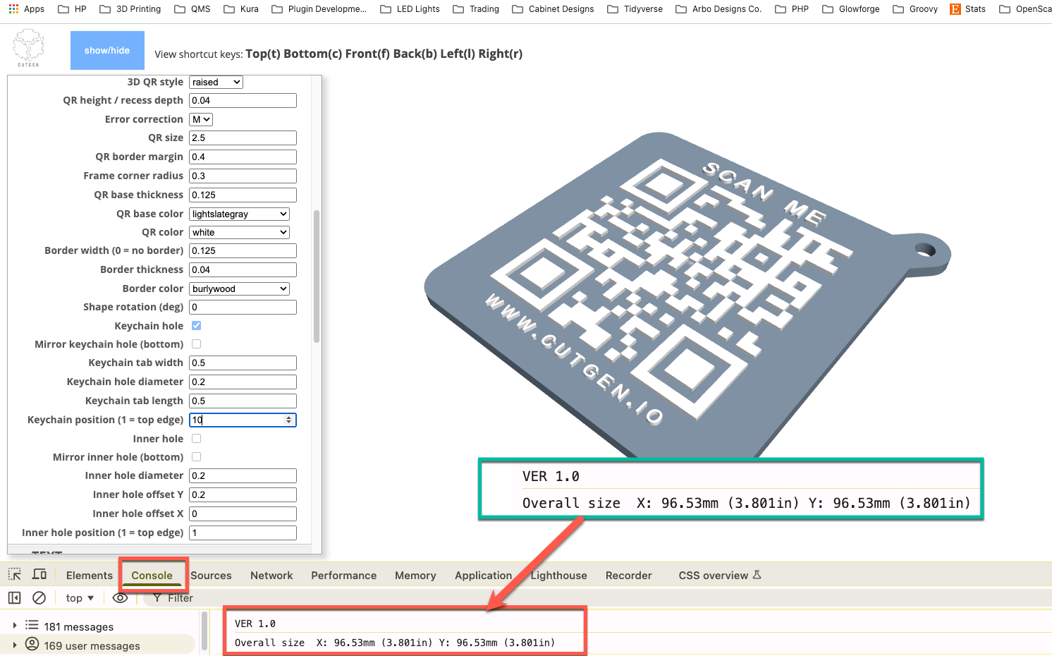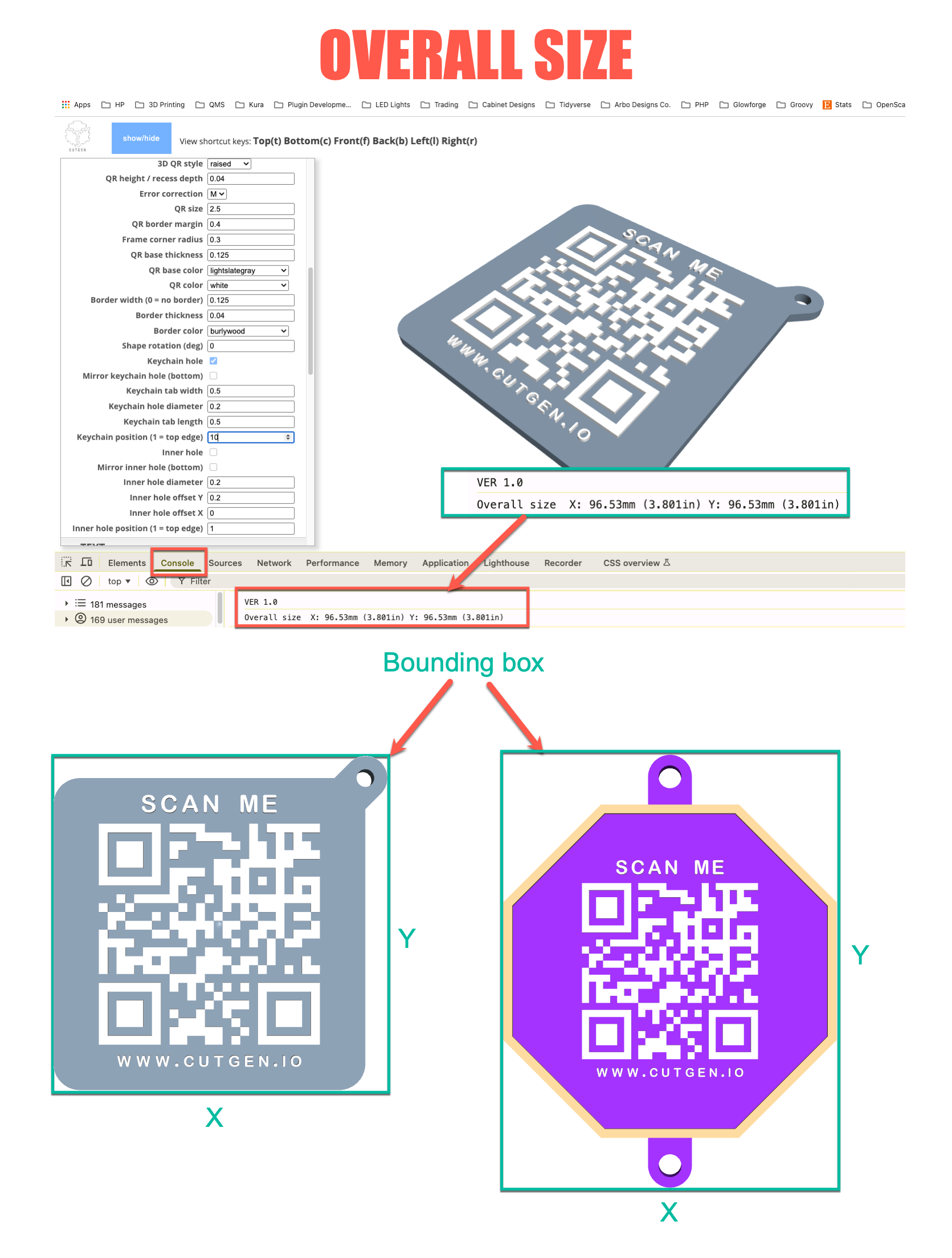 The ‘Overall Size’ is calculated by the ‘bounding box’ area of all the components. To view the Overall size, you will need to open up the browser’sweb developer tools and click on CONSOLE.