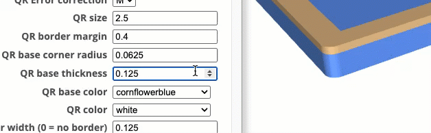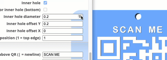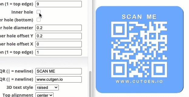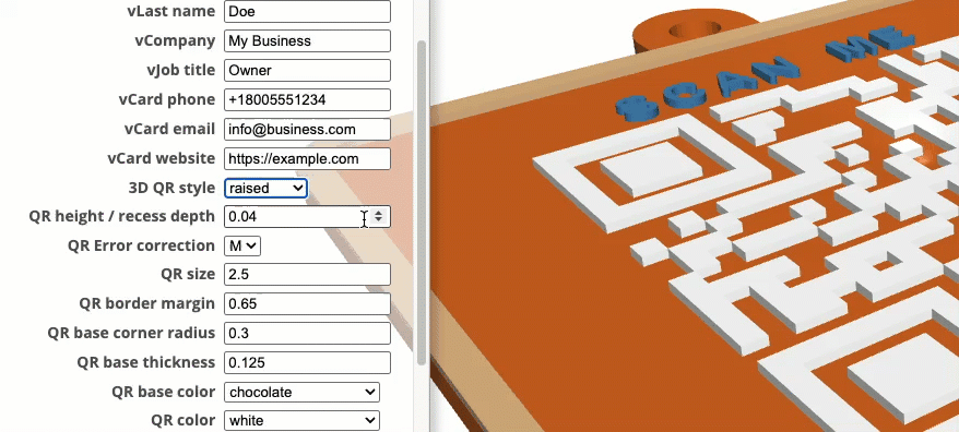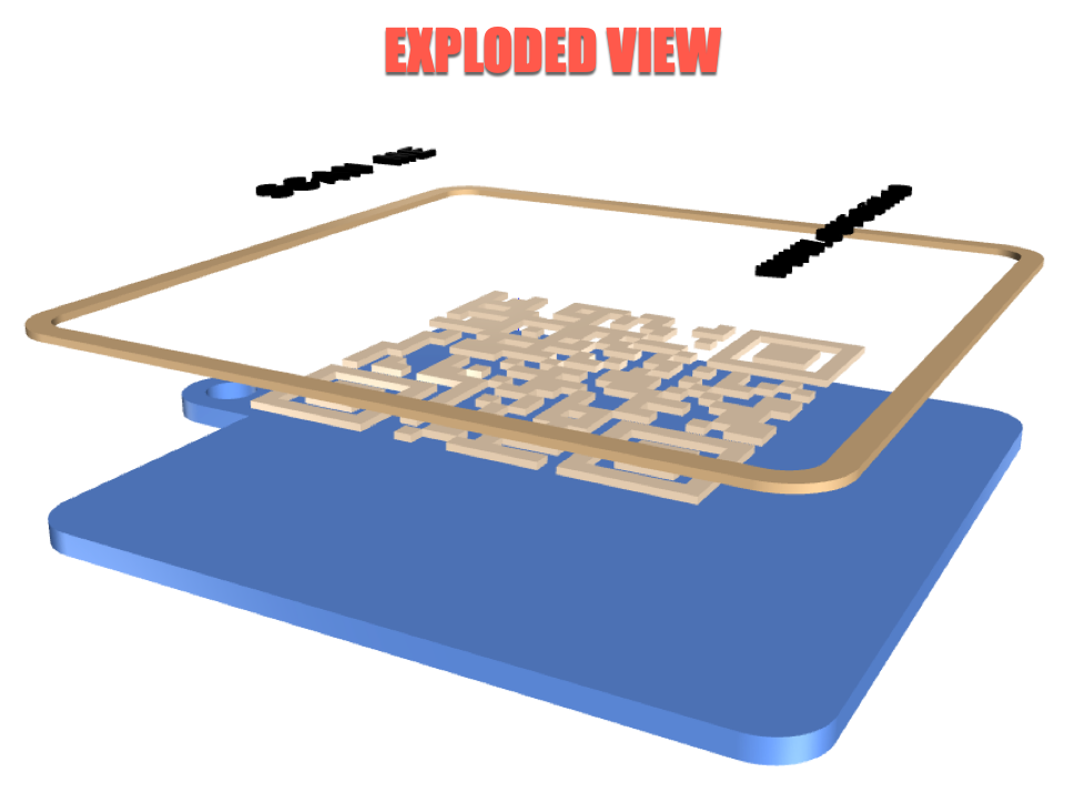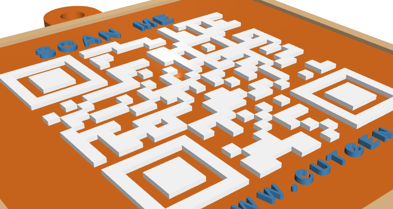 The QR Code, can be either raised or recessed. Laser cutters/engravers will be recessed (material burned away). 3D printers can print either styles, but the ‘raised’ QR code will work much better, but some experimentation may be needed.