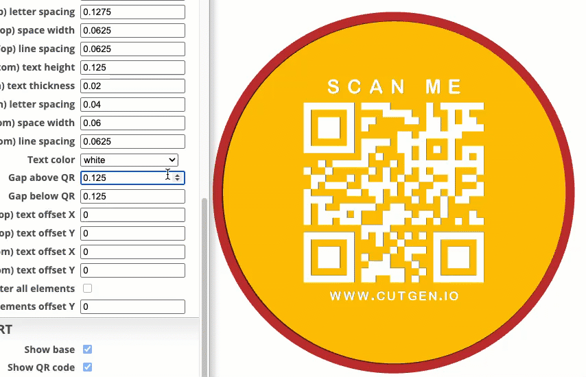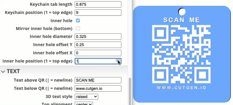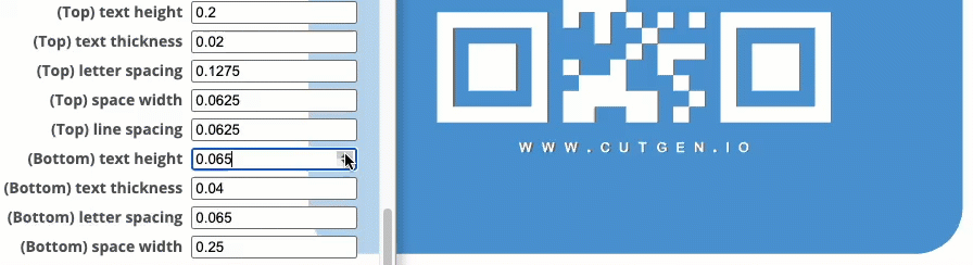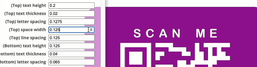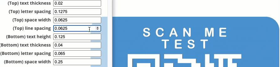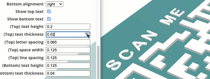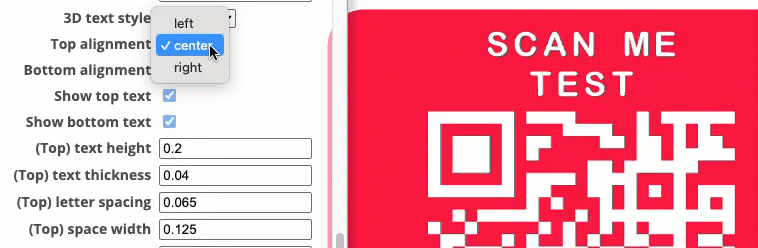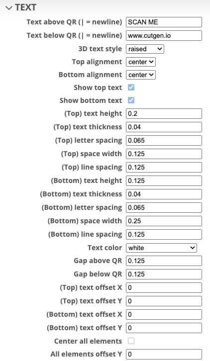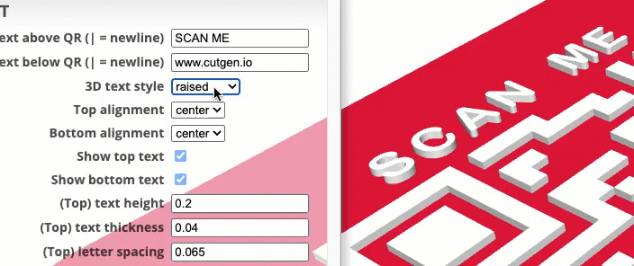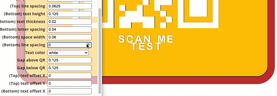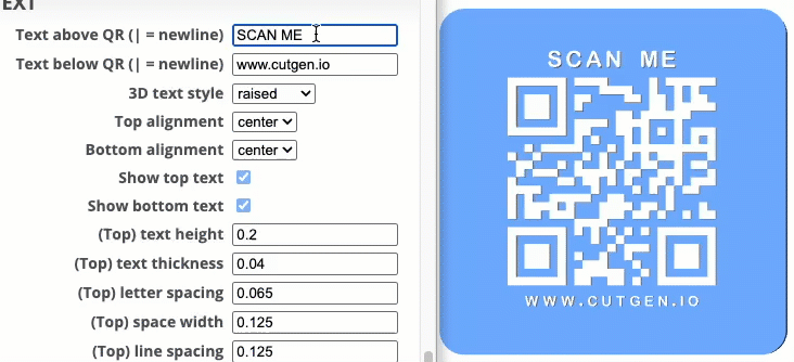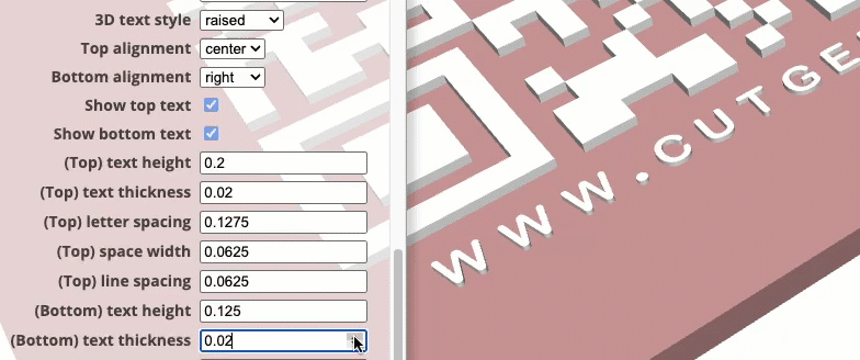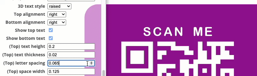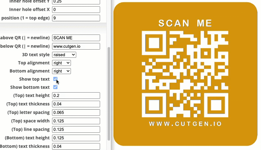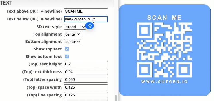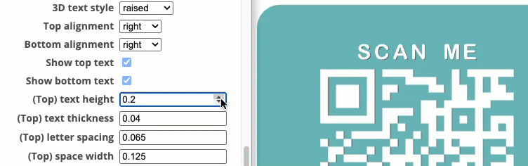 I’ve found that 3D raised text Top/Bottom letters and QR code, works better than the recessed option. Raised, also works better with the slicer’s 'color change' option.